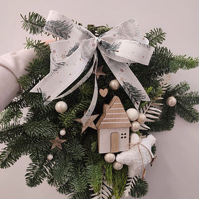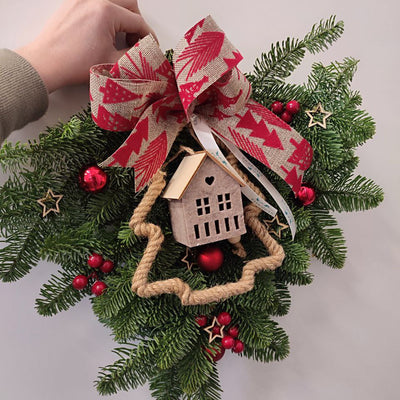Una ghirlanda elegante e ricca di dettagli, realizzata a mano con rami sempreverdi, poinsettia rossa e un maxi fiocco decorativo. Perfetta per ingressi, porte e pareti: aggiunge subito calore e spirito natalizio alla tua casa.