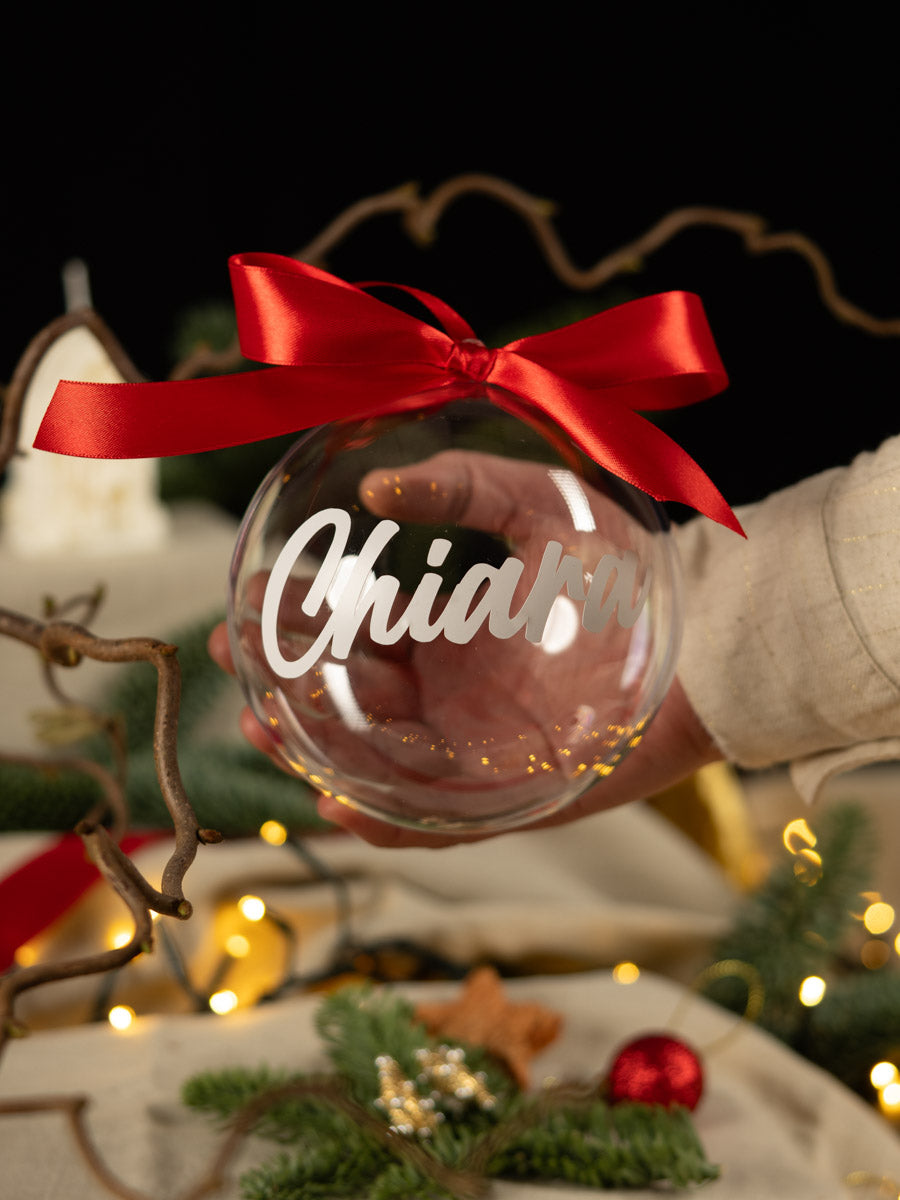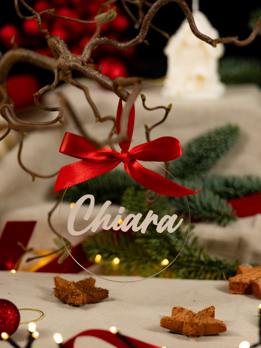 Decora il tuo albero con un tocco unico: una targhetta in acrilico trasparente, incisa con il nome che preferisci e rifinita con un elegante fiocco rosso. Perfetta come idea regalo o come dettaglio speciale per la casa durante le feste.